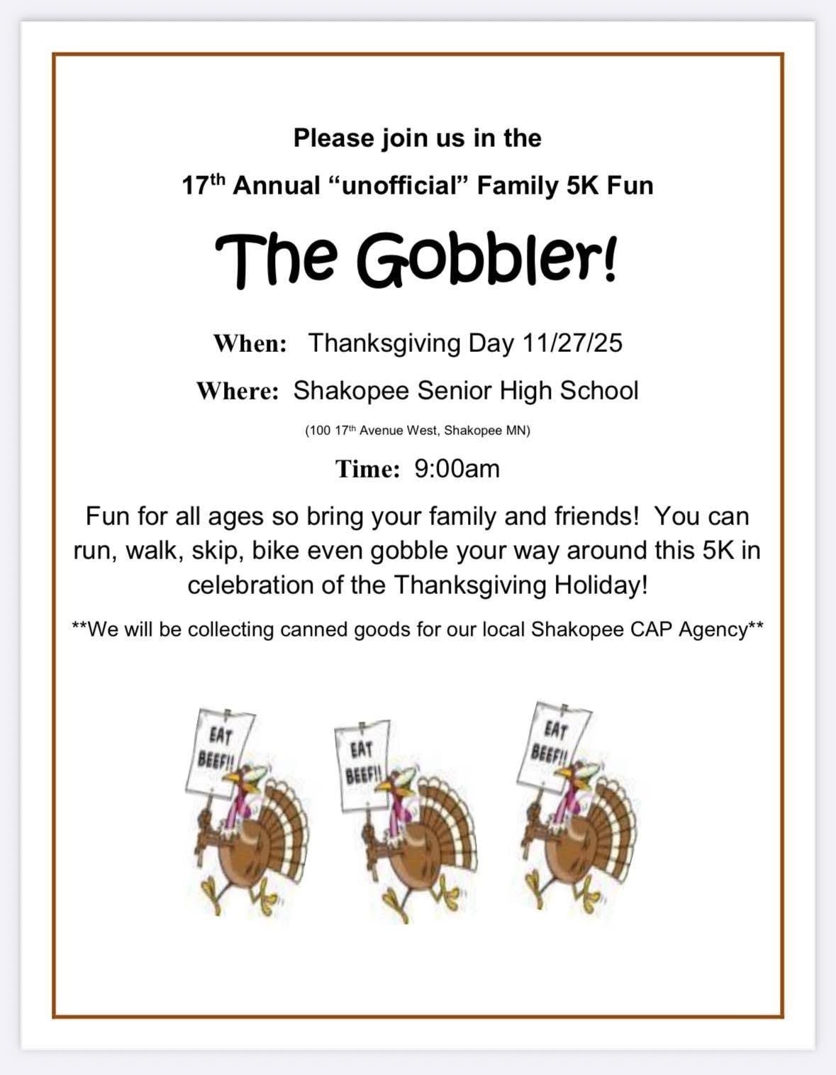 This year’s “Gobbler” will take place on Thursday morning, Nov. 27th - (Thanksgiving Day) beginning at 9:00am. The unofficial 5k route will once again begin at the Shakopee Senior High School (100 17th Avenue) parking lot. From there they will travel east along 17th Avenue to Spencer Street, then head north to 10th Avenue, then head west (past West Middle School) to Fuller Street, then turn south - heading back to 17th Avenue, where they will return to the SHS parking lot. Those who wish to participate are encouraged to bring a canned good or cash donation if you so choose. Wear some fun turkey day apparel if you wish. Bring your kids, your pets, your parents, and your grandparents! Again, there is no registration required or fee to participate. It’s just an informal gathering of family, friends, and community members who feel blessed in life, and want to share that feeling with others. Weather is predicted to get a bit colder later this week, so dress for the weather and feel free to wear a costume or turkey hat!