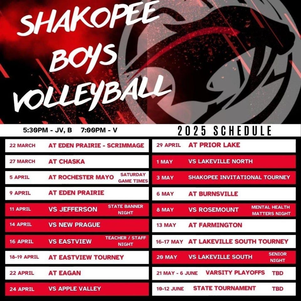 It’s history in the making! After 7 years as a club team, the Shakopee High School Boys’ Volleyball Team is now one of 87 Minnesota high schools officially participating as a Minnesota State High School League-sanctioned sport, following the long-awaited approval by the MSHSL in 2023—making 2025 the inaugural season for Minnesota high school boys’ volleyball!