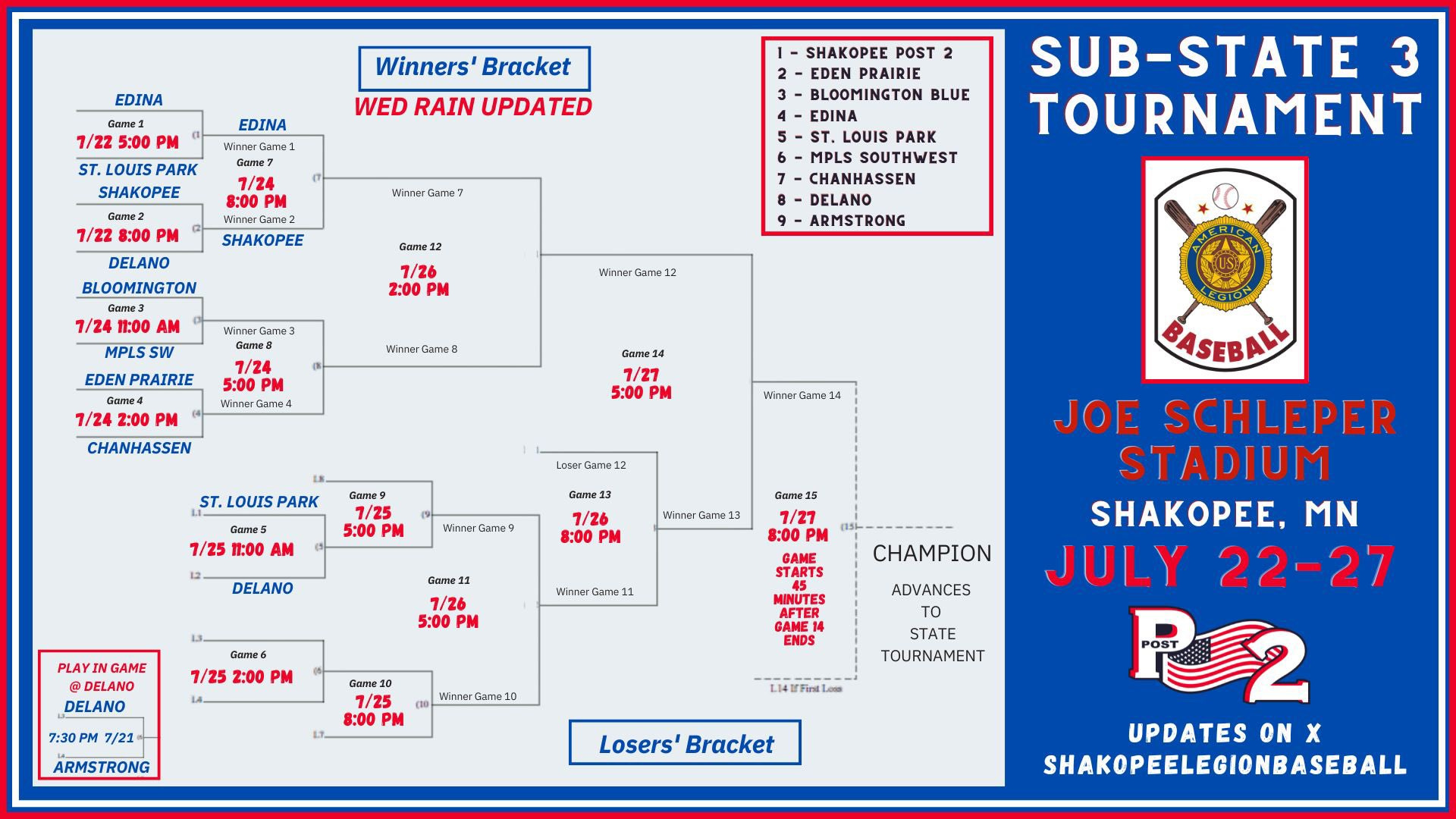 Shakopee’s Post 2 Legion ballclub is seeded #1 in Sub-State 3 and will take on the winner of the play-in game between Delano and Armstrong, which will be played Monday evening in Delano. Shakopee will host the winner of that game on Tuesday, July 22, 2025, at 8:00 p.m. at “The Joe” (Joe Schleper Baseball Stadium). Edina will take on St. Louis Park just prior to the Post 2 game, beginning at 5:00 p.m. on Tuesday.