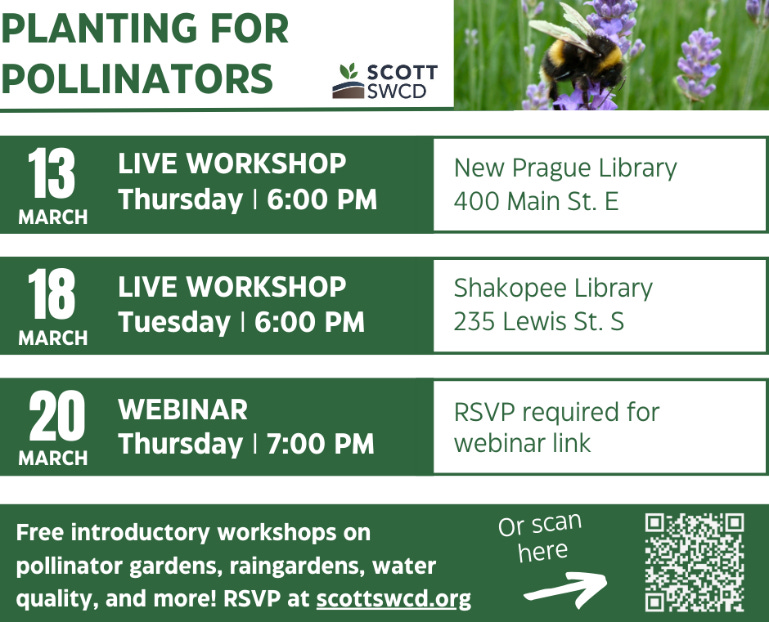 The Scott Soil and Water Conservation District (SWCD) is excited to host a series of free introductory workshops on all things pollinator gardens, raingardens, shoreline buffers, and water quality.