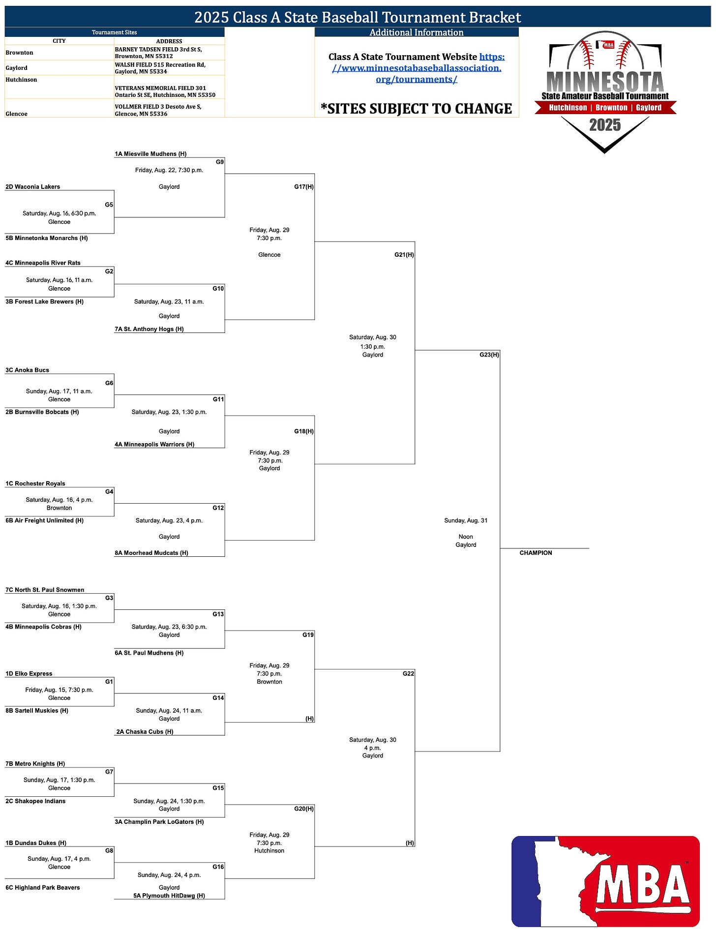 Below is the Class A bracket so you can follow along and, hopefully, find time to take in a game or two. Should the Indians win their first game, they would play again the following Sunday, Aug. 24, at 1:30 p.m. in Gaylord.
