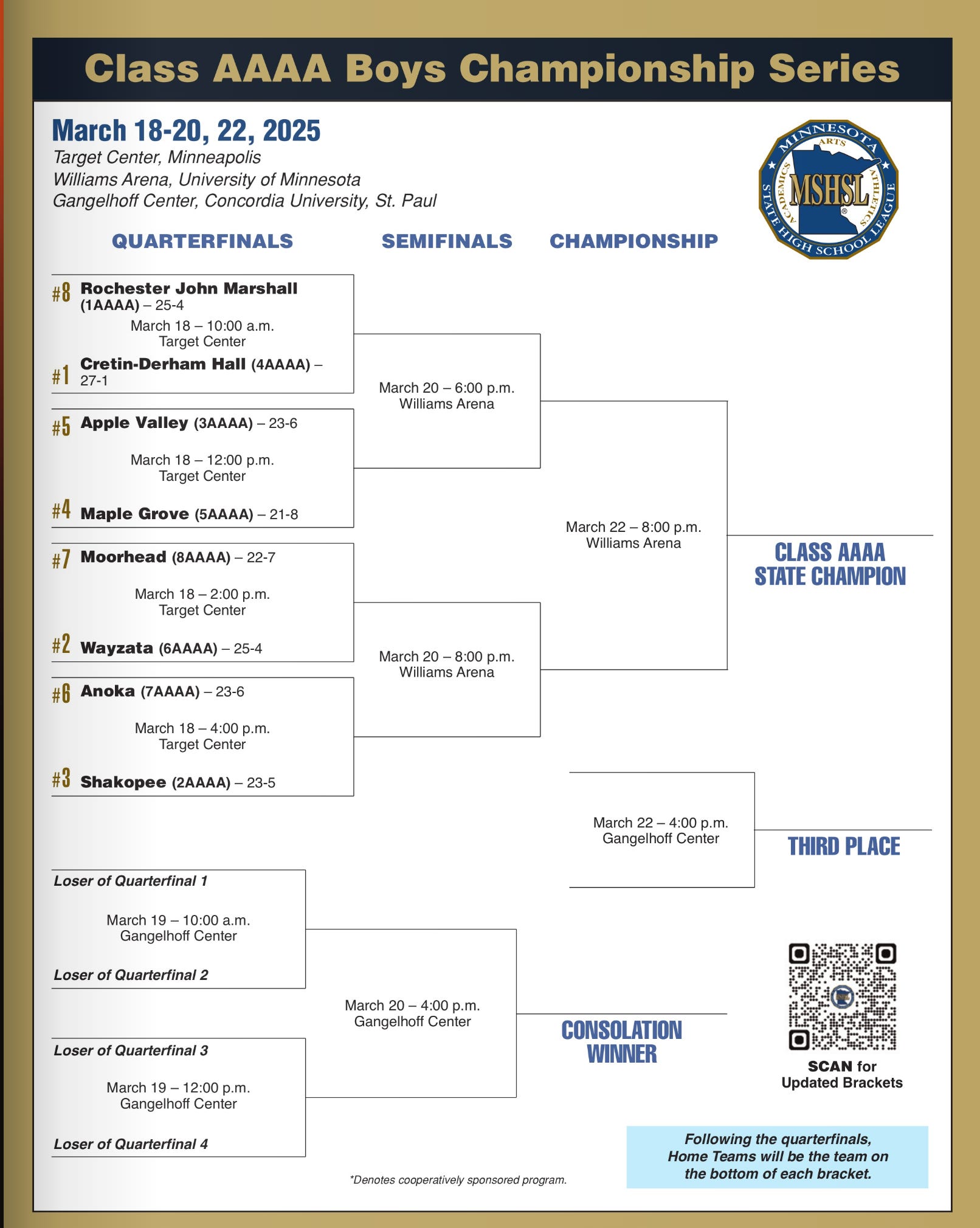 • State tournament tickets can be purchased online at MSHSL Tickets.